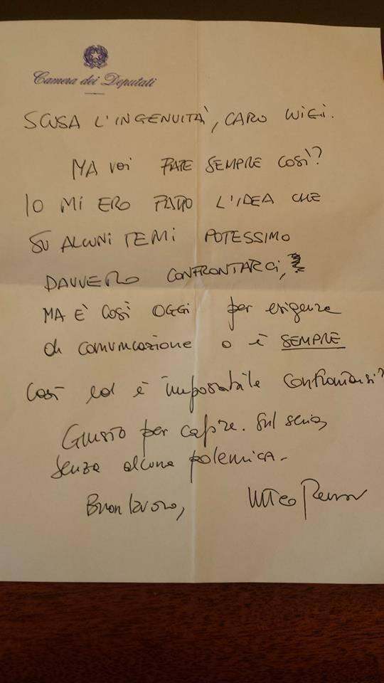 Cari amici grillini,avete perso un'altra opportunità di cambiare l'Italia, e questo è un vero peccato. Il Presidente del Consiglio vi ha chiesto,anche troppo gentilmente, visto che inerlocutori siete, un appoggio per cambiare quelle regole che tanto non vi piacciono e voi avete rifiutato. Tutti noi speriamo sempre in un cambiamento deciso e definitivo, per almeno 20 anni, anche i vostri elettori vi avevano obbligati di andare a parlare con Renzi, li avete traditi, per la testardaggine del vostro Capo tanto carismatico. Un'altra occasione persa per essere ricordati con benevolenza nella storia italiana, io non so se il vostro movimento sopravviverà alle prossime elezioni, io e molti altri ne siamo indifferenti, spero non darete colpa a qualcun'altro. Anche i biglietti inviati da Renzi per chiedere di cambiare le avete rifiutati con disprezzo e quello che è peggio li avete chiamati "pizzini"... vergogna, non sapete ciò che dite...vergogna, li chiamava cosi la mafia. Continueremo a seguirvi e vedremo quante altre volte non afferrerete le possibilità di aiutare l'Italia in questo momento... Buona fortuna grillini e non dimenticate che anche a Firenze la festa del grillo non viene più svolta.
